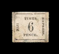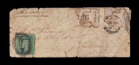1401 c S.G. #2-3 imageS.G. #2-3, 1870 3p Black and 6p Black on rose quadrille paper, positions 2 and 20, on the third of the three known complete covers with the rose quadrille paper issues, this a small lady's cover, the stamps and cover are in typical faulty condition, this one more so than the other two with serious faults to the stamps, heavy edge wear and portion of backflap missing, each of the two stamps with ms. "#" cancel and the 3p is additionally tied by "DE 31 1870 Sydney/NSW" duplex, the "NSW" portion of another strike of this duplex was used to tie the New South Wales 3p Green (S.G. #158) at bottom left, posted to Melborne where backstamped, on January 3, 1871. Like the other two covers this one also has an interesting unique characteristic. At upper left it is endorsed "with newspaper". Whether this was to indicate that it was attached to a newspaper, or a message to the recipient that he should expect a newspaper at the same time is not known. Additionally this cover is important in the authentication of the previous cover. Both of these covers arrived in Sydney, New South Wales on the same day, were handled in an identical manner and each went to Melbourne, but each is from a different correspondence and the covers have entirely different philatelic provenance. Examination of the Sydney duplexes and the Melbourne backstamps show numerous characteristics confirming that they were struck by the same devices as would be expected and should be the case. Thus this cover, which has the older provenance, confirms the authenticity of the Rewa cover. Despite the condition problems, which are a given, this is a marvelous and rare cover of the "Fiji Times Express"; ex-Sir Lacon Threlford and "Missionary" collection; photocopy of 1975 RPS certificate and 1981 RPS certificate being a duplicate of the previous (Scott #2-3). (Image) Est. 7,500-10,000