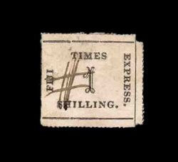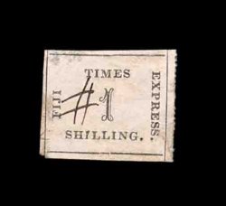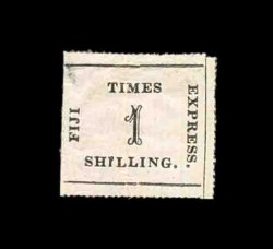 1414 og S.G. #9 imageS.G. #9, 1871 1/- Black on rose laid batonne paper, position 9, three large margins with full rouletting, trimmed along the frame at left, perhaps the sharp impression caused it to separate there, o.g., small corner thin, otherwise a fresh fine stamp (Scott #10; $1,500.00). (Image) £1,200