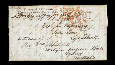 1561 c image1840 Inbound letter to "Somo-Somo, Fejee Islands", interesting and lengthy entire folded letter to The Reverend R. B. Lyth, a Wesleyan missionary whose correspondence provides us with several early letters tracing his work in New South Wales, the Friendly Islands (Tonga) and Fiji Islands in the late 1830's and 1840's, this letter was written at Hull England on March 27, 1840 but not posted from there until April 24th and prepaid by ship letter through London to Sydney, Australia, rated 8(p) in red and with black crown oval "General Post Office/Sydney/SE 3 1840" on the reverse, posted in care of the Wesleyan Mission House in Sydney who provided for its transmission to Fiji, ms. endorsement on arrival "Somo somo, June 28, 1841 per Triton" illustrates the great length of time for transit to this remote location, a similar docketing of August 15, 1842 may have been the recipient"s notation of when a reply was sent, an interesting tidbit in the letter speaks of the new 1p postal reform that had taken place in England and the humorous absurdities that were perpetuated on the post office because of it, the letter is in an excellent state of preservation and a marvelous item for the postal historian giving insight into early postal communications in the South Seas that the missionaries "enjoyed" there, very fine. (Image) Est. 750-1,000