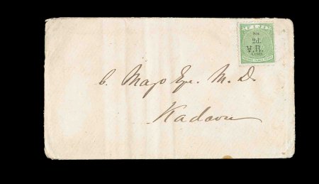 1562 c S.G. #24e imageS.G. #24e, 1875 Black "2d" on "Six Cents" surcharge on 3p Green with Gothic "V.R.", variety inverted "A" for "V", position 30, properly affixed and uncancelled on inter-island cover addressed to "C. Mayo Eqre. M.D./ Kadavu", this was an early post office on the small island of Galoa off the mainland of Kadavu, there is a very faint indecipherable straight line handstamp on the reverse, the stamp has a rather substantial pre-affixing tear and minor creases to the cover, but the stamp is rare in its own right with only 159 examples believed to have been issued (S.G. mint £3,000; used £1,200), and inter-island mail with these issues at this period is very rare as very little was preserved; ex-Robertson (Scott #29a). (Image) Est. 750-1,000