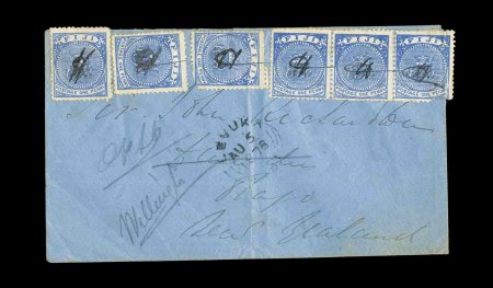 1563 c S.G. #31a imageS.G. #31a, 1877 1p Deep blue on laid paper with monogram "VR" overprint, horizontal strip of three and three singles on cover to Dunedin, New Zealand, each stamp with what looks to be an "LL" ms. cancel (possibly Loma Loma), which just ties one of the singles and the strip, "Levuka/Fiji/AU 5 1878" double arc cds below, interestingly this cover was redirected to Wellington with ms. "OPSO/Wellington" indicating that the addressee must have been a government official, "OPSO" stands for "On Public Service Only" and explains why no forwarding charge was made to the cover, on the reverse Auckland transit, backstamped Dunedin and then Wellington, two stamps including one in the strip have corner faults plus each with a crease, others are fine-very fine, cover has mostly minor cover faults including some tape mending on the reverse, a fine and very scarce early period cover that shows the postal history of both Fiji and New Zealand; ex-Marcel Stanley and Robertson (Scott #36). (Image) Est. 2,000-3,000
