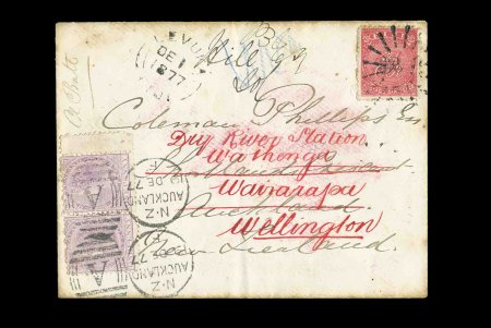 1564 c S.G. #33 imageS.G. #33, 1877 6p Rose on laid paper with monogram "VR" overprint, an attractive example with deep color, tied to cover to Auckland, New Zealand by "sunburst" cancel of Levuka with clear "Levuka/Fiji/DE 1 1877" double arc c.d.s., forwarded on arrival in Auckland to Wellington, with right gutter margin pair of 1p Lilac of New Zealand (S.G. #152) tied by two strikes of Auckland duplexes, backstamped Auckland and Wellington, faint vertical cover crease, light edge toning to the cover slightly affecting the stamps, despite this the condition is actually quite nice and very fine for this early period; the red ink used for the new address, the color of the stamps and the lovely combination franking make for a very attractive and scarce cover; ex-Purves, Marcel Stanley and Robertson (Scott #39). (Image) Est. 3,000-4,000