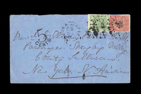 1565 c S.G. #33 imageS.G. #33, 1877 6p Rose on laid paper with monogram "VR" overprint, along with 1879 2p Yellow green, perforated 12 1/2, in mixed issue franking, tied to attractive cover to the United States by "sunburst" cancels of Levuka, with nice strike of "Levuka/Fiji/MR 29 1880" double-arc c.d.s. at left, neat "5/Cents" due marking, prior to Fiji's admission to the U.P.U., postage only paid the rate to the United States port of entry, internal postage was collected from the recipient, portion of San Francisco steamship transit on the reverse, few minor perf. flaws to stamps and backflap is largely missing with small edge tear carrying to the front, very fine appearance and scarce early franking (Scott #39,41). (Image) Est. 750-1,000