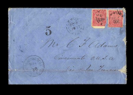 1566 c S.G. #33a imageS.G. #33a, 1877 6p Carmine rose on laid paper with monogram "VR" overprint, two singles (damaged) on linen-lined cover to the United States, stamps are tied by "Levuka/Fiji/OC 5 1877" double-arc c.d.s., with an additional strike at left, routed through San Francisco with that port's steamship transit c.d.s. and backstamped Cincinnati, horizontal crease at bottom of cover and other edge faults, but a scarce early cover and franking (Scott #39). (Image) Est. 400-500