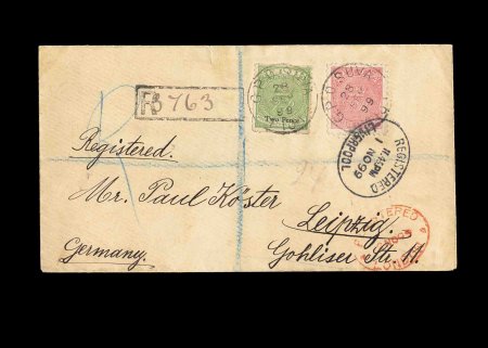 1567 c S.G. #36, 45 imageS. G. #36, 45, 1878 "Two Pence" surcharge on 3p Green and 1885 6p Pale rose, perforated 10, both well centered and neatly tied to registered cover to Leipzig, Germany by well struck "G.P.O. Suva/Fiji/28 Sep 99" cds, 6p is also tied by black Liverpool oval transit, red London oval below, backstamped, tiny edge tear at top, otherwise very fine and particularly attractive cover (Scott #43, 46). (Image) Est. 300-400