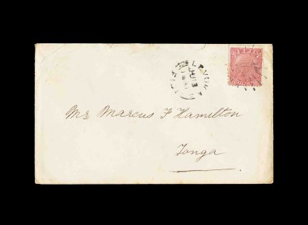 1568 c S.G. #38 imageS.G. #38, 1880 6p Rose, perforated 12 1/2, tied to attractive single-franking cover to Tonga by "sunburst" cancel of Levuka, with nice strike of "Levuka/Fiji/JU 13 1881" double-arc c.d.s. at left, portion of backflap missing from opening leaving a couple of small divots at top, a fine and scarce cover of what can be considered inter-island mail as the "Friendly Islands" are in close proximity and were closely related postally to the Islands of Fiji, little mail of this sort was preserved; ex-Robertson (Scott #43). (Image) Est. 500-750