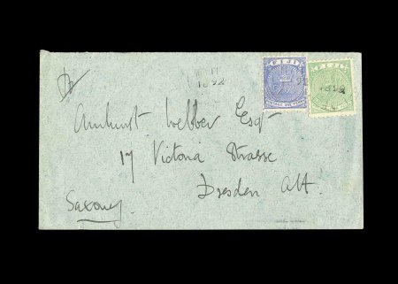 1569 c S.G. #39-40 imageS.G. #39-40, 1881-90 1p Grey blue and 2p Yellow green, perforated 10, tied to neat cover to Germany by type Ia March 11, 1892 c.d.s. of Suva (very little of the town name prints), the rate indicates this was evidently sent as printed matter, backstamped Dresden, very fine and an unusually attractive nineteenth century cover (Scott #40-41). (Image) Est. 300-400