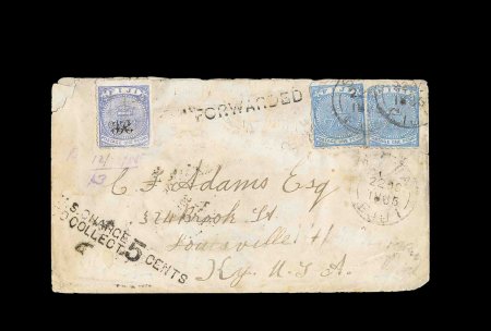 1570 c S.G. #39b imageS.G. #39b, 1883 1p Cambridge blue, perforated 10, two singles tied to cover to the United States by "Suva/Fiji/22 OC 1885" c.d.s., U.S. postage due marking at bottom left, this cover was addressed to Louisville, Kentucky but was forwarded to St. Louis, Missouri (address on the reverse), some place between Suva and Louisville other adhesives were lost as two pence was not the proper rate and there are impressions on the cover of other Suva cancels that were on the missing stamps, but the "Forwarded" straight line marking applied at Louisville is placed where the missing stamps were located indicating that they were already missing by the time it left Louisville, (there is an additional pen cancelled earlier issue stamp affixed at left that does not appear to belong), backstamps and transits trace the cover through San Francisco, Louisville and St. Louis, condition is typical of covers of this period and the extensive travels it underwent with edge faults, nevertheless an interesting postal history item (Scott #40a). (Image) Est. 300-400