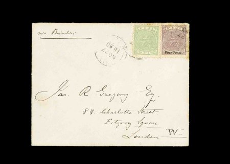 1571 c S.G. #40, 42 imageS.G. #40, 42, 1881-83 2p Yellow green and "Four Pence" type A surcharge on 2p Pale mauve, perforated 10, tied to neat 1890 cover to England by Suva c.d.s., routed by the western route through Brindisi, backstamped London, stamps with minor perf. toning and 4p has small cuts from date of the cancel, otherwise a very fine and pretty cover (Scott #41, 48). (Image) Est. 300-400