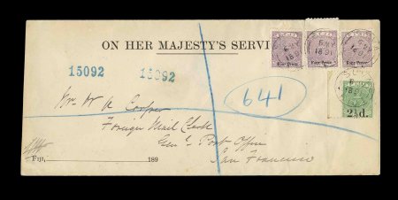 1572 c S.G. #41 imageS.G #41, 1890 "Four Pence" surcharge on 1p Mauve, three singles plus a corner margin single of "2 1/2d" surcharge 2p Green (S.G. #70; preaffixing pulled perforations at top right), all tied by "Suva/Fiji/6 May 1891" c.d.s. to O.H.M.S. registered cover to the foreign mail clerk at the San Francisco Post Office, nice registry and foreign division receiving markings on the reverse, a fresh and very attractive cover with scarcer franking, very fine official cover (Scott #47, 50). (Image) Est. 400-500