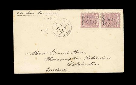 1573 c S.G. #42 imageS.G. #42, 1883 "Four Pence" type A surcharge on 2p Mauve, perforated 10, vertical pair tied to very neat Bank of New Zealand cover to England by "Levuka/Fiji/8 JY l885" c.d.s. with additional strike at left, backstamped Colchester on August 28th, stamps are fresh and centered just into design at left, very fine cover (Scott #48). (Image) Est. 200-300
