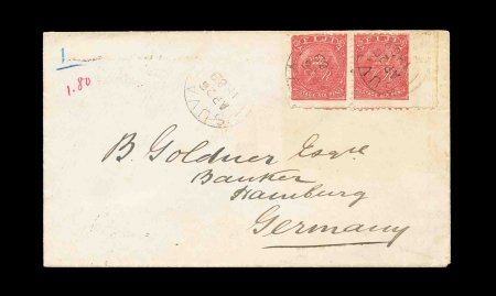 1574 c S.G. #45 imageS.G. #45, 1885 6p Pale rose, perforated 10, right margin horizontal pair with large selvage being imperforate between stamp and selvage, tied to cover to Hamburg, Germany by "Suva/Fiji/AP 25 1889" c.d.s. which impress the stamps as usual, carried by the western route through Italy with Milan, Naples and Florence transits, appears to be a commercial usage with corner card of an attorney in Suva on the reverse, stamps are fresh and centered just into the designs at top, very fine cover (Scott #43). (Image) Est. 400-500