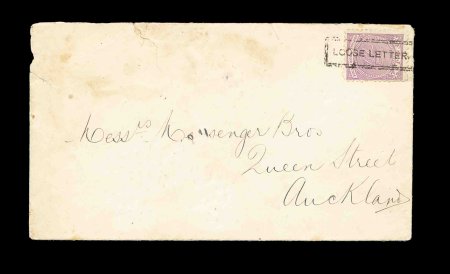 1575 c S.G. #56 imageS.G. #56, 1896 4p Mauve, perforated 11, tied to commercial cover to Auckland by scarce double boxed "Loose Letter" handstamp, back flap missing though portion of Auckland backstamp still shows, plus edge tears and abrasions to the front of the cover, not affecting the stamp or marking, despite the faults a rare usage of this stamp (Scott #42a). (Image) Est. 400-500