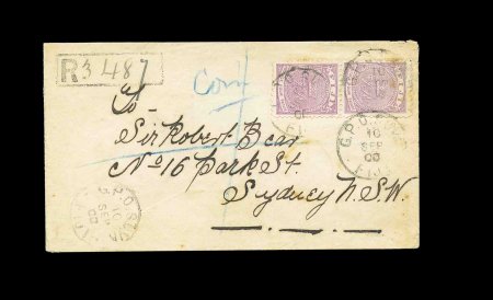 1576 c S.G. #56 imageS.G. #56, 1896 4p Deep purple, perforated 11, vertical pair tied to attractive registered cover to Sydney, New South Wales by three strikes "G.P.O. Suva/Fiji/10 Sep 00" c.d.s., with additional strike at left, backstamped, few minor spots of toning affect some perforations, otherwise stamps are well centered and a very fine registered cover (Scott #42). (Image) Est. 200-300
