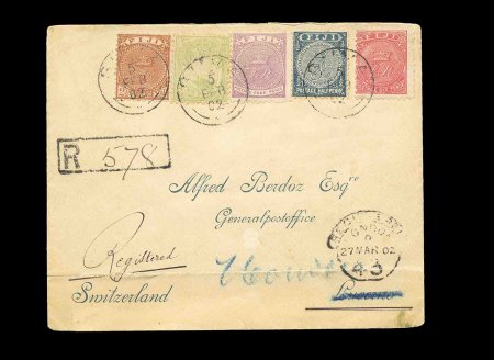 1577 c S.G. #56/103 imageS.G. #56/103 1902 Five-color franking on registered cover to Moudon, Switzerland, stamps include 2 1/2p Red brown , 4p Mauve and 6p Dull rose of the Monogram VR designs and 1/2p Greenish slate and 2p Dull green of the new Pirogue designs, perforated 11 except 1/2p and 2 1/2p which are perf. 11x12, all tied by three strikes of "Suva/5 Feb 02" c.d.s., London registry transit on front and backstamped, horizontal fold that breaks the paper at one end at the bottom of the cover, otherwise a very fine and colorful cover (Scott #42/57). (Image) Est. 400-500