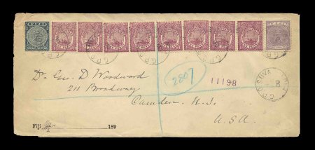 1578 c S.G. #56/101 imageS.G.#56, 1896 4p Mauve, perforated 11, well centered single of this value plus a pair and four singles of 1/2p Greenish slate and nine singles 1p Rosy mauve of the new Pirogue designs, both values perforated 11x12, all tied to large size commercial registered cover to Camden, New Jersey, actually the envelope is an O.H.M.S. envelope but the stamps have been applied over the imprint to use this as a regular envelope, all tied by "G.P.O. Suva/Fiji/4 Aug 00" c.d.s., because the stamps are on both front and back the cover has been opened out for display, some edge wear, still a fine and scarce franking (Scott #42a, 53, 55). (Image) Est. 500-750