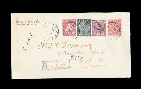 1579 c S.G. #57, 58a, 99, 101 imageS.G. #57, 1896 6p Pale rose, perforated 11, beautifully centered example of this scarcer perforation, along with fresh example of 4p Deep purple and later designs of 1/2p Greenish slate and 1p Rosy mauve, all perforated 11x12, tied to exceptionally clean registered cover to Newton, Mass. by "G.P.O. Suva/Fiji/28 Sep 01" cds, San Francisco registry transit on the reverse, extremely fine four color franking (Scott #42-43, 53, 55). (Image) Est. 500-750