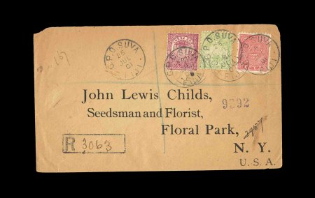 1580 c S.G. #57, 101-02 imageS.G. #57, 1896 6p Dull Rose, perforated 11, a lovely well centered example of this scarcer perforation on commercial self-addressed cover for a florist in Floral Park, New York, also has 1p Rosy Mauve and 2p Dull green of the later design, both perforated 11x12 (S.G. #101-02), this cover was posted from a country post office tying stamps by two light type IIIa "P.O./?/Fiji/22 Jul 01" c.d.s., (the town name is not readable but from the configuration it is undoubtedly Lautoka), additionally cancelled by Suva c.d.s. on July 25th, San Francisco registry transit on reverse, trivial edge flaws to cover at top, otherwise fine and scarce cover (Scott #43, 55-56). (Image) Est. 300-400
