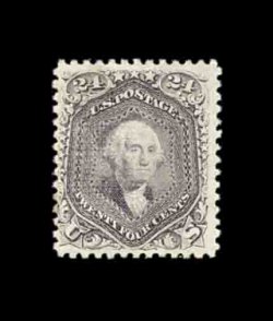 162 og 99 image#99, 24c Gray lilac, "F" grill, a highly desirable mint example of this notoriously difficult value, possessing an impressive overall brilliance rarely seen, with gloriously rich color and a prooflike impression on bright paper, while centered a bit to left this is actually far better centered than the great majority of known mint examples, in fact its perforations are essentially clear of the design all around which is a very rare occurrence, full o.g., lightly hinged, very fine and extraordinarily choice; of all the 1867 grilled issues, the Twenty Four Cent "F" Grill ranks as one of the most challenging to locate in premium original gum condition; 1991 and 2002 PF certificates. (Image) 6,000.00