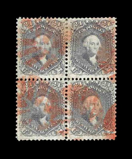 164 Obl 99 #99, 24c Gray lilac, "F" grill, an exceedingly rare and eye-appealing used block of four, being quite well centered for this perennially difficult stamp (although expertly reperforated at left), outstanding rich color and impression, postmarked with lovely light strikes of fancy leaf type cancellations in red, very fine appearance; this block is considered to be the finest that exists among the three or four known; ex-Emerson, Anderson and Hanschen. (Image) 7,250.00