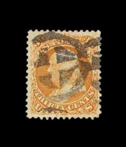 166 O 100 image#100, 30c Orange, "F" grill, a spectacular quality used example that is easily one of the very finest used Thirty Cent "F" grills extant, as this remarkable stamp is not only free of the flaws usually associated with this value, but its margins and centering are beyond compare, being incredibly well centered amid huge margins that are never encountered, even its color is far more deep and luxuriant than usual on bright fresh paper, choice strike of fancy geometric postmark in a small circle, extremely fine; a marvelous used gem for the finest collection; the Scott catalog states "Values for No. 100 are for copies with small margins, especially at sides. Large-margined examples sell for much more"; 2001 PF certificate. (Image) 750.00