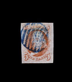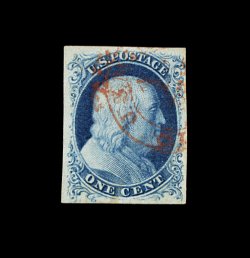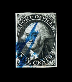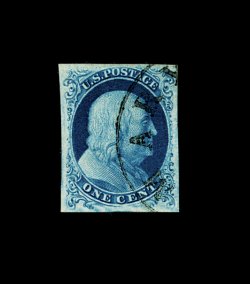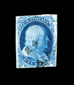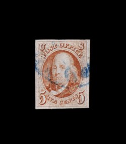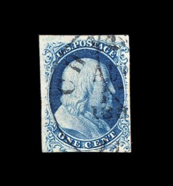 12 O 5 image#5, 1c Blue, Ty. I, position 7R1E, extraordinarily large margins virtually all around, just clear at bottom, being one of the very few existing examples whose design is completely intact all around, wonderfully fresh and distinctive early Plate 1 color, unusually lightly cancelled with a town c.d.s. which reads "24/Ala." at bottom, leaving the important Type I design characteristics completely unobscured, couple of miniscule surface scrapes that are so insignificant as to not even be mentioned on the accompanying certificate, extremely fine. An incredibly choice example of one of the rarest and most sought-after classic United States stamps. One position, the legendary position 7R1E, provides the philatelic world with the only full Type I design as originally intended, a characteristic no other One Cent imperforate displays. According to The Wagshal Census of 7R1E by Jerome S. Wagshal, there are only 90 confirmed examples of the imperforate Type I, the vast majority of which are used. When one eliminates those found on cover or in multiples, there are a mere 56 single examples available to collectors. Of this population very few are found with the overall eye-appealing characteristics this stamp possesses - most particularly its wide margins displaying a completely intact design. Fewer still have such wonderfully fresh color and are so lightly cancelled. A large majority of the recorded examples of Scott #5 have faults ranging from rather minor to severe. The couple of truly miniscule surface scrapes mentioned above are of no consequence. In fact, this stamp has traded several times in the past without any mention of surface scrapes and the Philatelic Foundation in 1999 (its most recently issued certificate for the stamp) have determined the stamp to be completely sound and issued an unqualified "it is genuine" certificate. In our opinion, this stamp is among the finest examples available of this world-class rarity. ex-Puliafito. (Image) 45,000.00