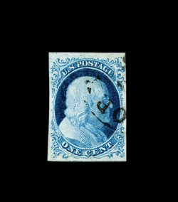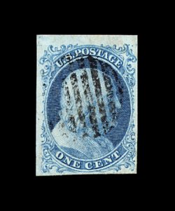 13 O 5A image#5A, 1c Blue, Ty. Ib, position 9R1E, a superb used example of this classic rarity, being in a condition that would be quite a challenge to duplicate, featuring exceptionally large margins all around, including a sizable portion of the sheet margin at top, with the design well clear all around, lovely rich and bright early color, with a sharp well-defined impression on immaculate paper, very light and unobtrusive central strike of a circular grid, an extremely fine gem for the most meticulous collector; 2002 PF certificate. (Image) 6,750.00