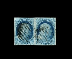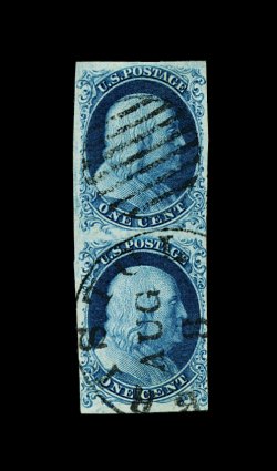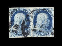 15 O 7, 5A image#7, 5A, 1c Blue, Ty. II and Ib combination pair, positions 2-3R1E, premium quality used example of this exceedingly rare combination pair, the left stamp being Ty. II, while the right stamp is the elusive Ty. Ib, large and well balanced margins all around, warm rich color distinctive to plate one early stamps and well defined impressions on bright paper, central grid postmarks, extremely fine; plate one early produced only six possible Ty. Ib positions, all from the top row of the pane, the other four positions consist of three Ty. II's and, of course, the famous Ty. I, position 7R1E, only two places from the top row could produce the Ty. Ib and Ty. II combination, positions 9-10R1E and positions 2-3R1E, the latter with the Ty. Ib being the right stamp as is found in this pair, making this one of the rarest of all possible One Cent Blue imperforate combinations, and this particular pair is believed to be the finest of the few Ty. II and Ty. Ib combination pairs in existence; the rarity of this particular combination is underscored by the fact that it is unlisted in the Scott catalog; 1976 PF certificate (accompanied by a 1995 letter from the PF clarifying the positions on the pair); ex-Chapin. (Image) Est. 7,500-10,000
