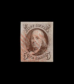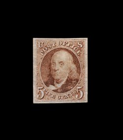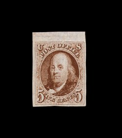 2 og 1 image#1, 5c Red brown, a magnificent quality mint example, being in a condition that is far superior to the vast majority of known mint copies of this classic, possessing extraordinary overall physical characteristics, not the least of which is its remarkable overall freshness and brilliance, with beautifully rich color and a sharp detailed impression from an early printing on crisp paper, impressively margined with extra-large margins all around, including a sizable sheet margin at top, incredibly clean full o.g. that has been only very lightly hinged, extremely fine gem; an extraordinarily rare stamp to find in both this superb condition and still retaining its full original gum; the last comparable quality mint example to appear at auction was the Hall example which was sold in the May 2000 "Rarities of the World" Sale (Robert A. Siegel Auction Galleries, Inc.) for $22,000.00, plus the 10% buyer's premium; 1987 PF certificate; ex-Chapin. (Image) 6,250.00