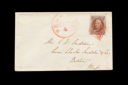 3 c 1 image#1, 5c Red brown, lovely single example featuring four very large margins tied to small cover to Boston by red squared grid postmark, matching "New-York/Sep 4" c.d.s. at left, stamp also features rich luxuriant color and a well defined impression, an extremely fine stamp on a very fine cover; ex-Chapin. (Image) 675.00