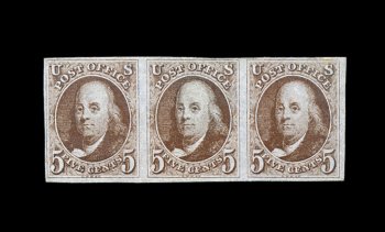 4 og 1a image#1a, 5c Dark brown, a magnificent mint horizontal strip of three in the most pristine state imaginable, possessing spectacularly rich dark brown color and a superbly detailed early impression on brilliantly fresh paper still retaining its original bluing, margins range from full at top and left to large at bottom and at right, its reverse is equally impressive featuring extraordinarily clean and full o.g. that has been lightly hinged, there is just the slightest trace of a small toned spot on the right stamp (at top right) that is of little significance, very fine and exceedingly choice; an important mint Five Cent 1847 Issue multiple, being one of the largest and finest known in the dark brown shade; 1969 and 2002 PF certificates. (Image) 24,000.00+