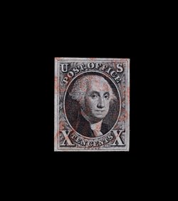 7 O 1c image#1c, 5c Red orange, a breathtaking used example of this distinctive color, boasting enormously large margins all all around, showing bits of the frame lines from the adjoining stamps at top and bottom, incredibly rich and unmistakable red orange color on very fresh paper still retaining much of its original bluing, boldly postmarked with a circular grid cancel in deep blue, an extremely fine gem in the most optimal condition possible and quite likely the finest quality used example in existence; any example of this, the rarest of all the Five Cent 1847 colors, is a terribly elusive stamp, and when found they invariably have small faults, very few exist sound, and only a tiny fraction of these are found with with margins that can even compare to those found on this remarkable copy; obviously undercataloged when one considers that this example realized $13,200.00 (including premium) when last sold at auction in 1999; 1994 PF certificate (submitted by Raymond H. Weill Co.); ex-Argentum and Chapin. (Image) 6,000.00
