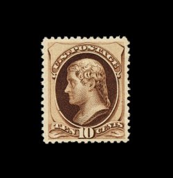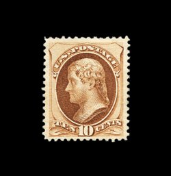 285 og 188 image#188, 10c Brown, with secret mark, brilliantly fresh and choice mint example of this very scarce stamp, well centered within uncharacteristically large margins, intensely rich color and a deeply etched impression on crisp paper, full clean o.g., lightly hinged, certainly extremely fine for the issue; a stamp that is missing in even advanced collections of mint U.S. stamps; 2002 PF certificate. (Image) 2,000.00