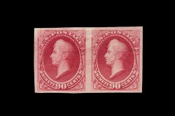 290 og 191b image#191b, 90c Carmine, imperforate, horizontal pair, unusually fresh, four uniformly large margins, rich luxuriant color, especially clean full o.g. (most known examples have disturbed gum), lightly hinged, trace of a trivial thin speck on right stamp not mentioned on accompanying certificate, otherwise extremely fine; clear 1972 PF certificate; ex-Chapin. (Image) 2,500.00