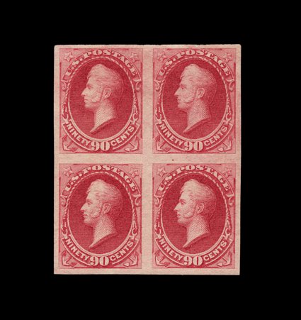 291 ogbl 191b image#191b, 90c Carmine, imperforate, a showpiece block of four of this very rare imperforate variety, being one of just a few blocks in existence, large margins all around, gloriously rich color, full o.g., top pair h.r., bottom pair lightly hinged, extremely fine; 1981 PF certificate; ex-Chapin. (Image) 5,000.00+