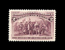 309 nh 231 image#231, 2c Columbian, impeccably centered amid extravagantly large margins, prooflike color and impression, pristine o.g., n.h., extremely fine gem; 2002 PF certificate for a strip of three from which this stamp was taken. (Image) 42.50