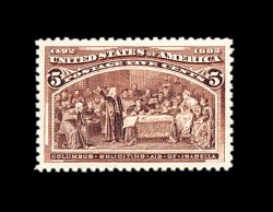 312 nh 234 image#234, 5c Columbian, perfectly centered amid extravagantly large margins, rich luxuriant color and a razor-sharp impression on bright fresh paper, unblemished o.g. without a single gum bend or skip, an extremely fine gem; a most impressive never hinged Five Cent Columbian; photocopy of a 2002 PF certificate for a block of four, this being the top right stamp. (Image) 190.00