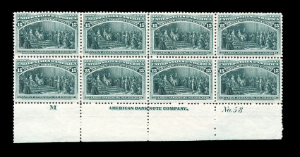 313 ogPB 238 image#238, 15c Columbian, an extraordinarily choice full top margin letter "M", imprint and plate "No. 58" block of eight, being in a condition unlike any other we have had the pleasure to offer, possessing outstanding centering and margins throughout the plate, sumptuously rich color and impression, pristine o.g., only a couple of faint hinge marks, extremely fine. (Image) 6,500.00