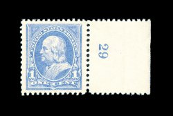 317 nh 246 image#246, 1c Ultramarine, right sheet-margin plate no. 29 single, flawlessly centered amid huge jumbo margins, bright fresh color, o.g., n.h., extremely fine; a striking large-margined gem that is seldom encountered this choice; 2001 PF certificate for a strip of three from which this stamp was taken. (Image) 75.00