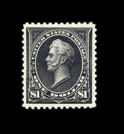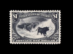 335 nh 292 image#292, $1.00 Trans-Mississippi, an incredibly handsome "post office" fresh mint example, marvelously well centered within very large margins, especially intense "jet" black color and a well incised impression on crisp paper, immaculate o.g. without a single gum bend or skip, never hinged, extremely fine; choice never hinged examples of this popular commemorative are few and far between; 2003 PF certificate. (Image) 3,000.00