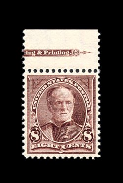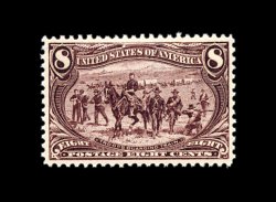 333 nh 289 image#289, 8c Trans-Mississippi, highly select mint example of this always difficult value, near perfect centering within uncharacteristically large margins, eye-arresting color in a far deeper shade than usual, razor-sharp impression, unblemished o.g., n.h., extremely fine gem; 2003 PF certificate for a vertical pair, this being the top stamp. (Image) 400.00