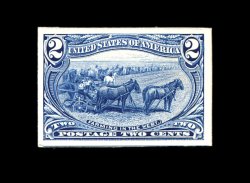 331 T 286TC4 image#286TC4, 2c Trans-Mississippi, trial color plate proof in blue, choice example of this handsome and rare trial color, four very large margins, intense color and impression, extremely fine; according to Brazer only three singles and two vertical pairs are known. (Image) 1,750.00