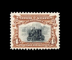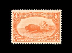 332 nh 287 image#287, 4c Trans-Mississippi, an incomparable jumbo-margined mint example, boasting absolutely immense margins for any value from the Trans-Mississippi series, and being flawlessly centered within these impressive borders, brilliantly fresh as well, with stunningly intense and vibrant color on pristine paper, immaculate o.g., n.h., extremely fine gem; a most remarkable stamp for the collector who seeks out stamps in truly spectacular quality; 2003 PF certificate. (Image) 325.00