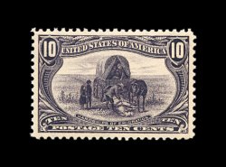 334 nh 290 image#290, 10c Trans-Mississippi, true gem example, boasting mathematically precise centering within considerably larger margins than typically encountered, also contributing to this stamp's exceptional overall eye appeal is its incredibly intense color in a deep shade, plus its impression is highly detailed, fully intact and even perforations, unblemished o.g., n.h., extremely fine; the perfect stamp for the collector who seeks out stamps only in the finest possible quality; photocopy of a 2002 PSE certificate for a block of four, this being the bottom left stamp. (Image) 400.00