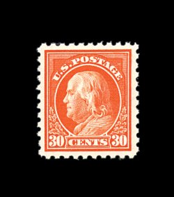 381 nh 439 image#439, 30c Orange red, an incredibly choice mint example, marvelously well centered within extraordinarily large margins, strikingly intense color and a deeply etched impression, pristine o.g., n.h., extremely fine; a lovely gem for the most fastidious collector; 2003 PF certificate. (Image) 550.00