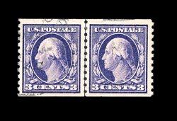382 O 445 image#445, 3c Violet flat plate coil, perf. 10 vert., a magnificent quality used guide line pair, incredibly well centered within extravagantly large margins all around, eye-arresting rich color and a razor-sharp impression on bright paper, very lightly cancelled with desirable town postmark, extremely fine; quite likely the finest example of this very rare used line pair in existence; 2003 PF certificate. (Image) 2,500.00