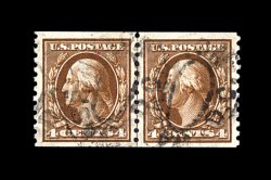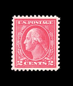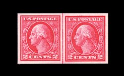 387 nh 459 image#459, 2c Carmine imperforate coil, a gem example of this very scarce joint line pair, without the usual crease between the stamps, incredibly fresh, with absolutely gorgeous intense color and impression, four large and wonderfully well balanced margins, even the joint line is printed cleanly and perfectly, pristine o.g., n.h., extremely fine; uncreased examples of this line pair are especially elusive and desirable in this premium quality; the catalog value quoted in Scott is for a line pair with the usual crease; 2003 PF certificate. (Image) 1,600.00+