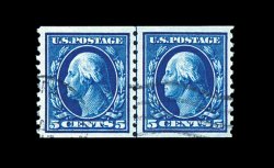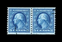384 O 447 image#447, 5c Blue flat plate coil, perf. 10 vert., guide line pair, used, extraordinarily well centered within large margins, deep luxuriant color and a strong impression, very light and unobtrusive wavy line machine pmk., extremely fine; quite likely one of the finest used line pairs of Scott #447 available; 2002 PF certificate. (Image) 800.00