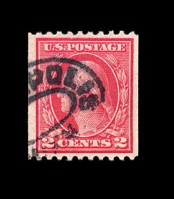 385 O 449 image#449, 2c Red rotary coil, Ty. I, perf. 10 horiz., select used example of this truly rare coil, possessing near perfect centering amid large margins all around (including at top and bottom, which is a difficult feature to find), rich deep shade, bold portion of double oval postmark, extremely fine; 2000 PF certificate. (Image) 600.00