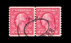 390 O 491 image#491, 2c Carmine coil, Ty. II, perf. 10 vert., handsome used pair of this coil rarity, remarkably bright and fresh, rich distinctive carmine color and a crisp impression, well centered, neat strike of a Brooklyn, N.Y. double oval postmark, very fine; used pairs of this are not often encountered this fresh and clean; 2002 PF certificate. (Image) 3,750.00